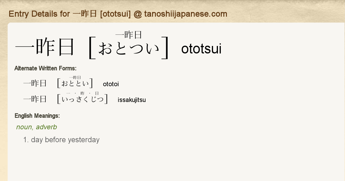 Entry Details for 一昨日 [ototsui] - Tanoshii Japanese