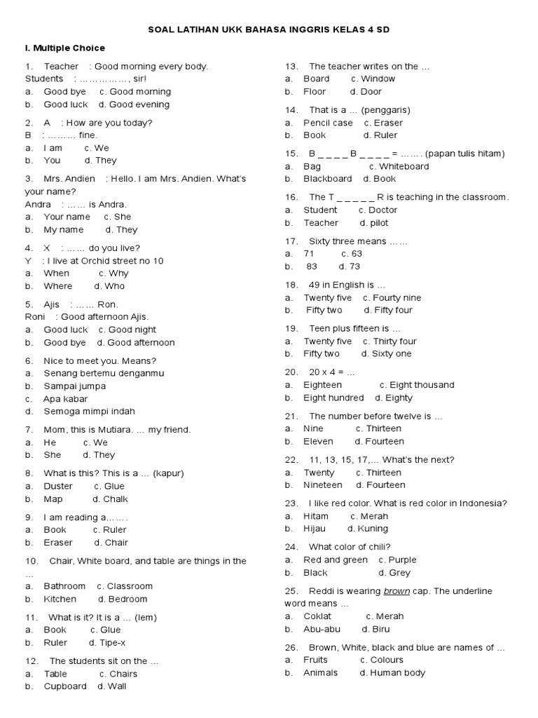 Soal Latihan Ukk Bahasa Inggris Kelas 4 Sd