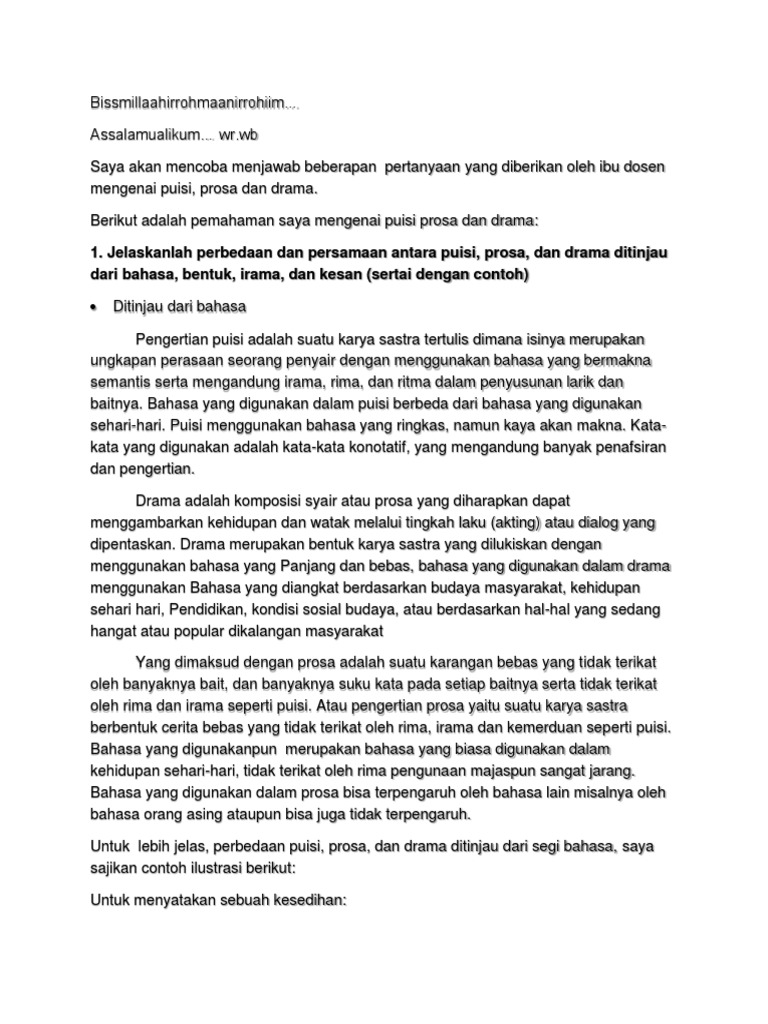 1. Jelaskanlah perbedaan dan persamaan antara puisi, prosa, dan drama ditinjau dari bahasa, bentuk, irama, dan kesan (sertai dengan contoh)