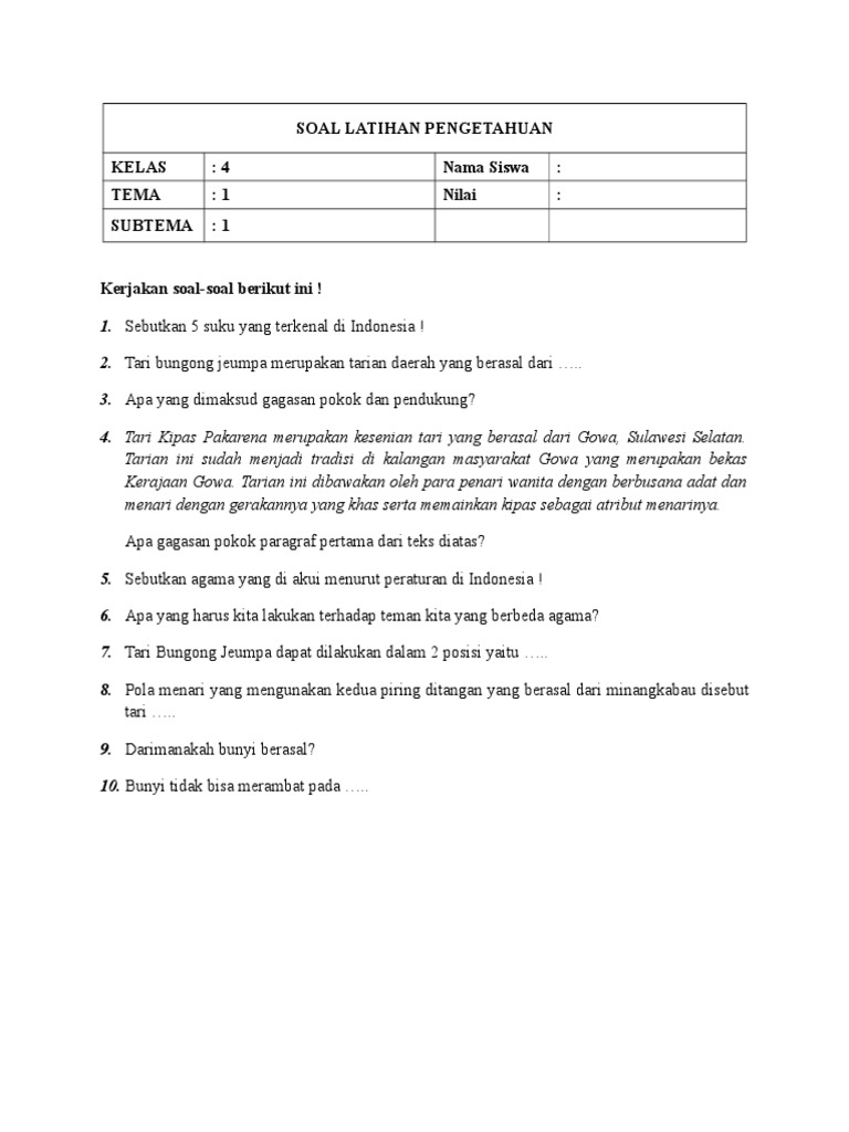 Soal Latihan Pengetahuan Kelas: 4 Nama Siswa: Tema: 1 Nilai …