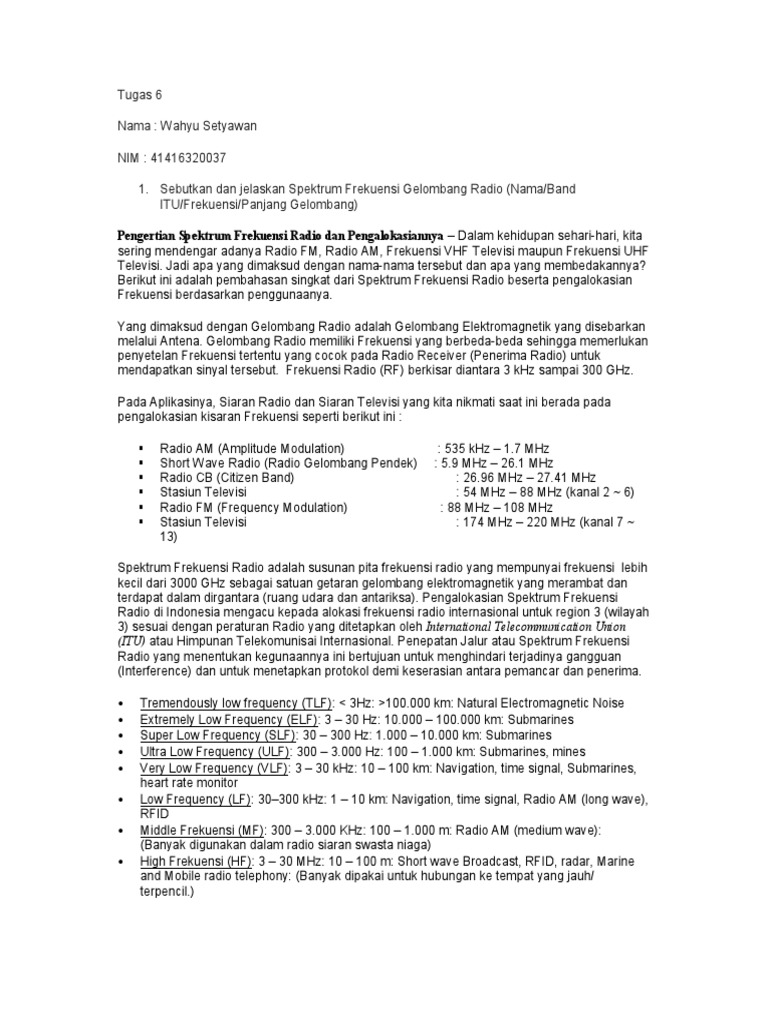 Tugas 6 Nama: Wahyu Setyawan NIM: 41416320037 1. Sebutkan dan jelaskan Spektrum Frekuensi Gelombang Radio (Nama/Band ITU/Frekuensi/Panjang Gelombang)