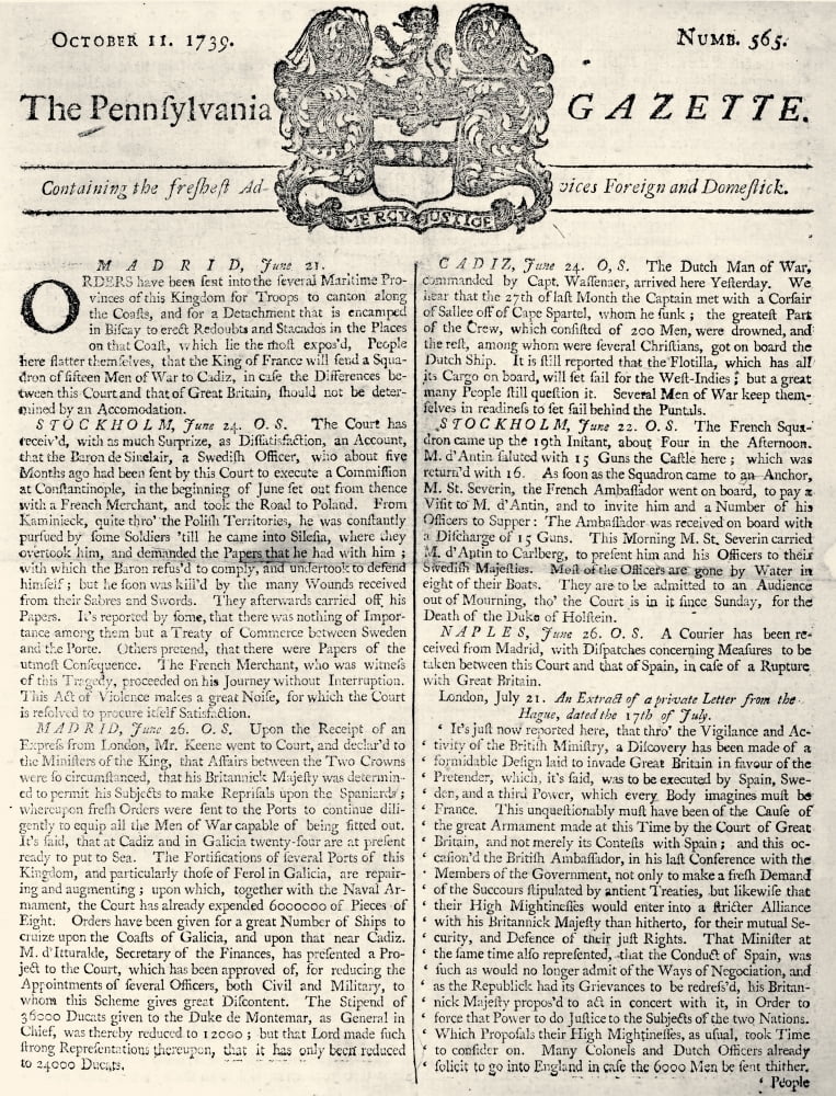Pennsylvania Gazette 1739 Nfront Page Of Benjamin FranklinS …