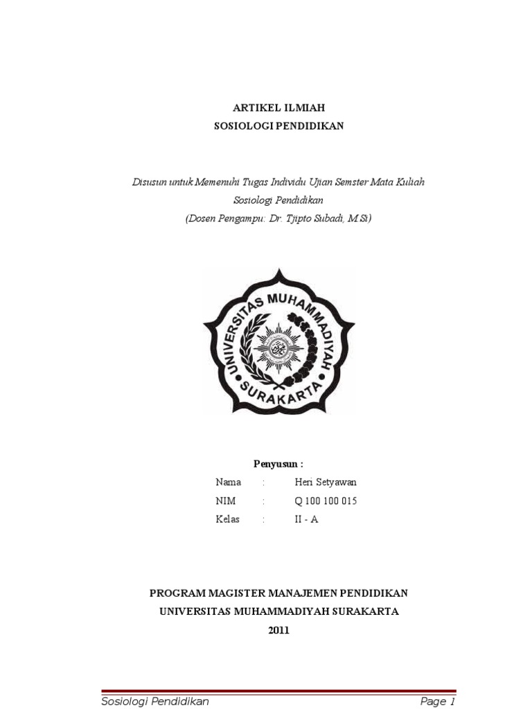 Tugas Artikel Ilmiah Sosiologi Pendidikan (Heri Setyawan-q100100015)