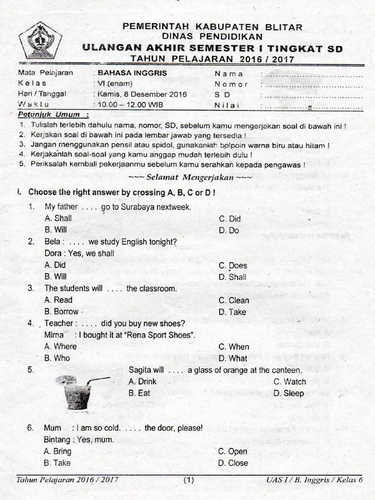 PAS 1 KELAS 6 B. INGGRIS (2016-2017) 2017-2018