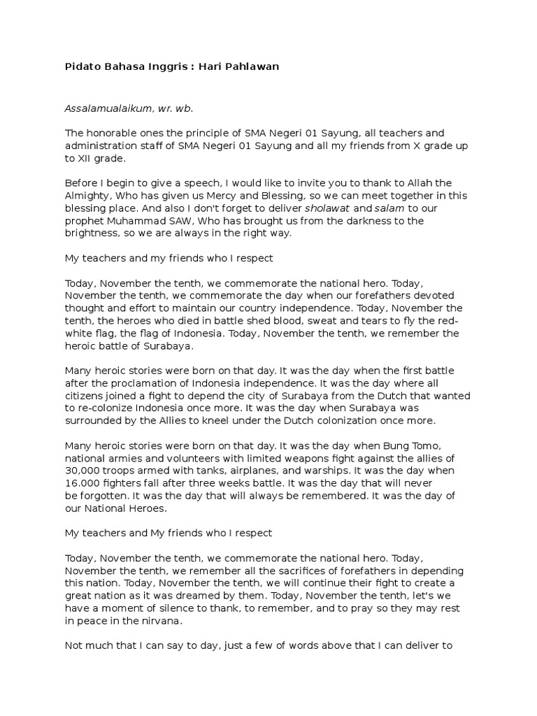 Assalamualaikum, wr. wb.: Pidato Bahasa Inggris: Hari Pahlawan
