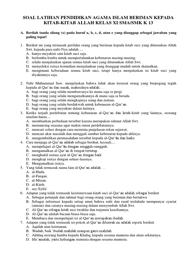 SOAL UAS GANJIL AGAMA KELAS 11.docx - A PILIHAN GANDA 1 Berikut ini yang termasuk perilaku orang yang beriman kepada kitab suci yang diturunkan Allah | Course Hero