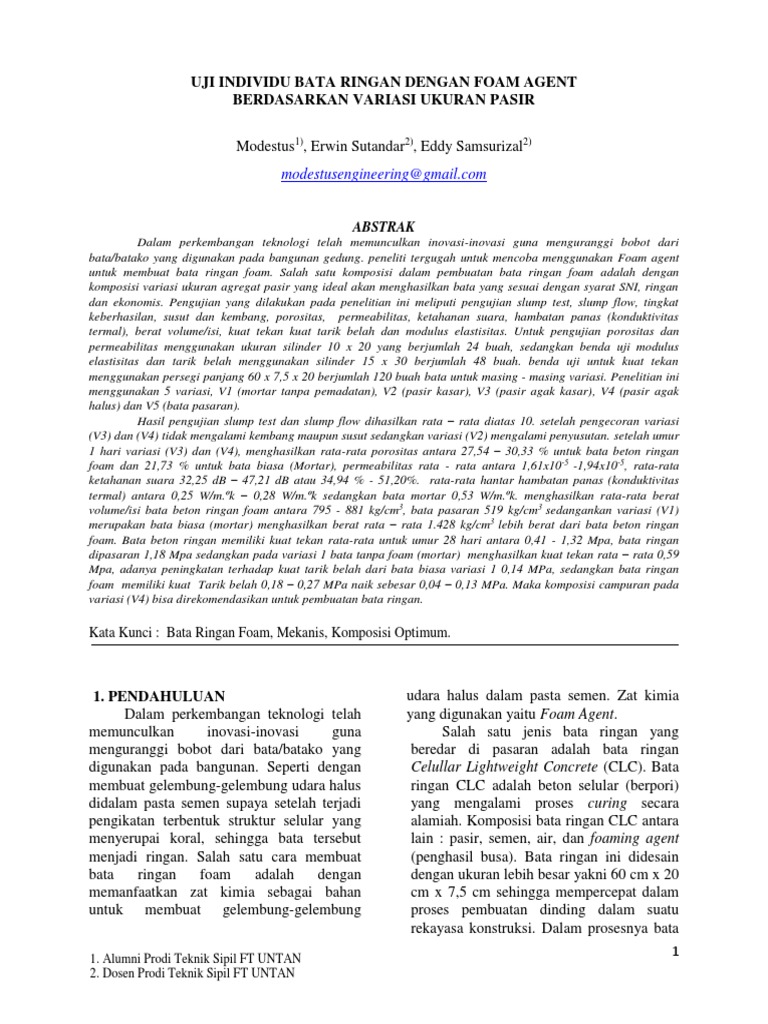 PEMANFAATAN FOAM AGENT DAN MATERIAL LOKAL DALAM PEMBUATAN BATA RINGAN - PDF Free Download