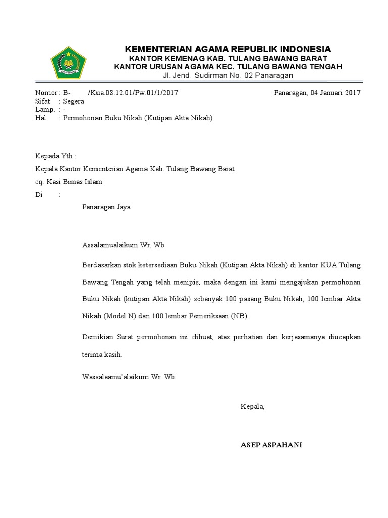 Surat Permohonan Buku Nikah