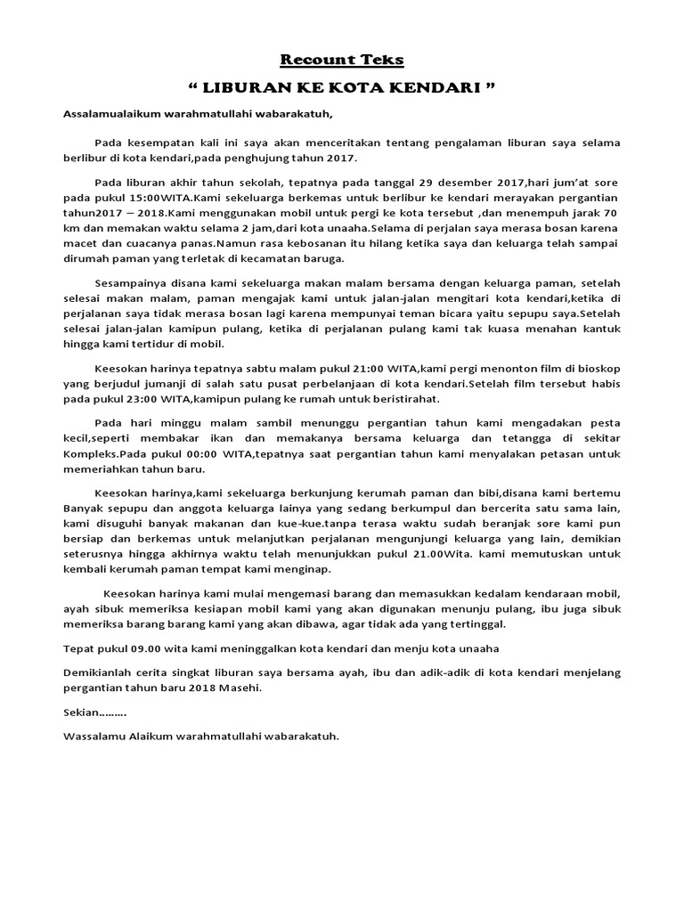 Recount Teks “ Liburan Ke Kota Kendari ”: Assalamualaikum …