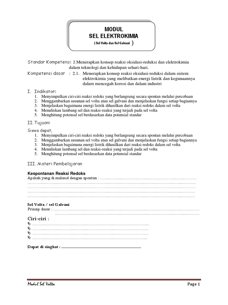 MODUL SEL ELEKTROKIMIA Volta / sel Galvani Prinsip dasar …