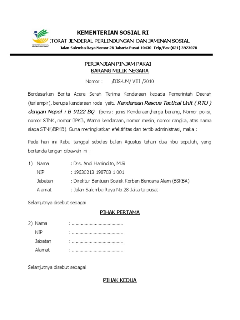 Contoh Surat Perjanjian Pinjam Pakai Barang Milik Daerah