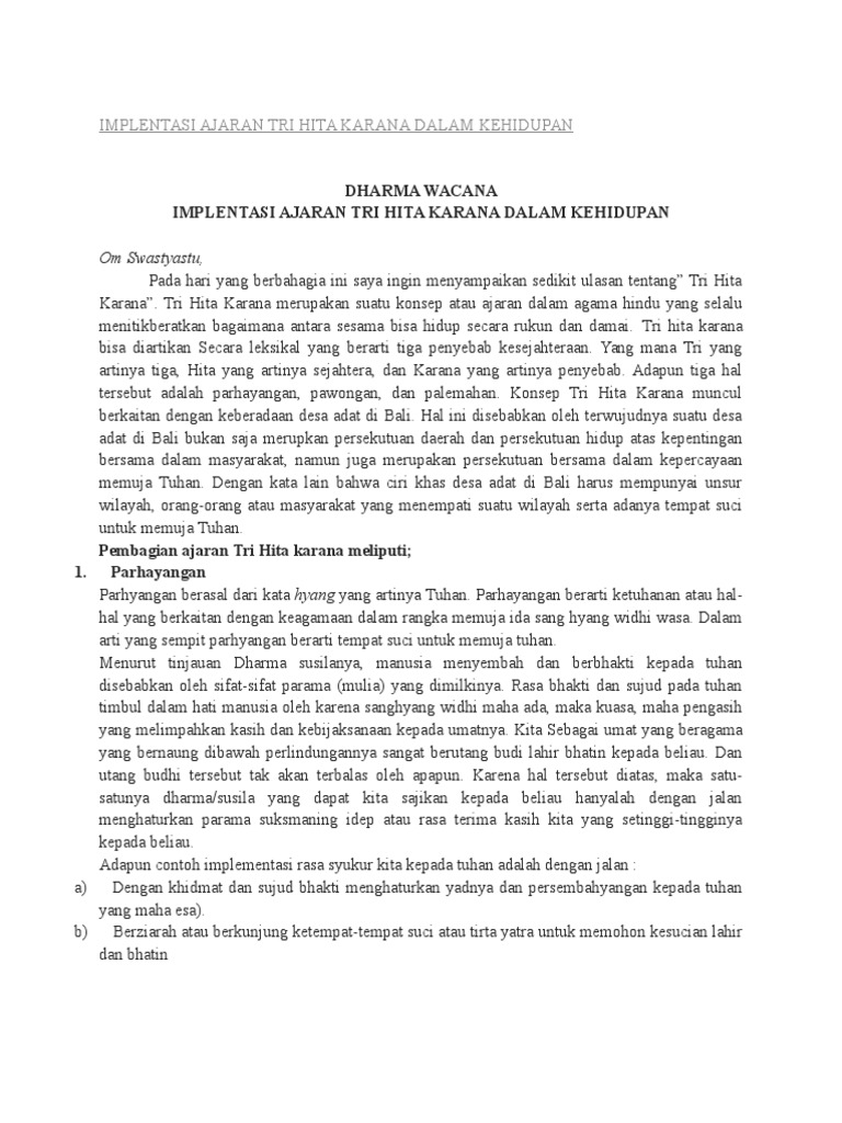 DHARMA WACANA IMPLENTASI AJARAN TRI HITA KARANA DALAM KEHIDUPAN …