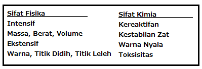 Sifat Ekstensif : sifat materi yang bergantung pada jumlah dan ukuran zat misalnya volume, massa, dan berat. Sifat Intensif : si
