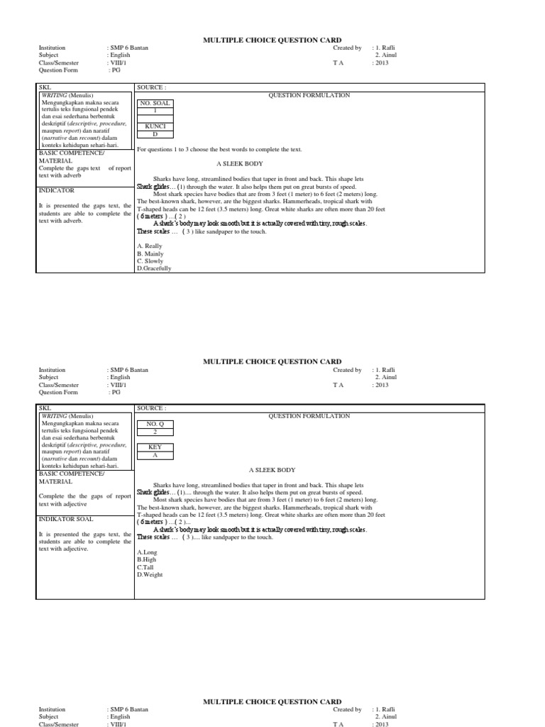 Kartu Soal Bentuk Pilihan Ganda | Nature