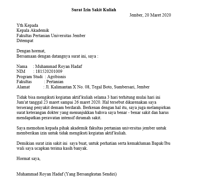 Contoh Surat Izin Sakit tidak Masuk Kuliah Formal (Mahasiswa …