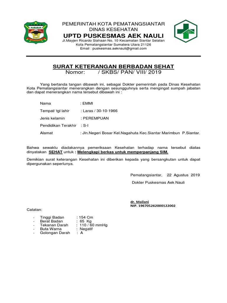 Uptd Puskesmas Aek Nauli: Surat Keterangan Berbadan Sehat