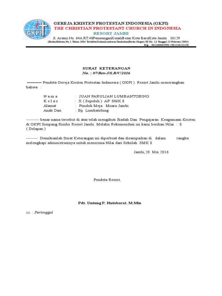 Contoh Surat Keterangan Nilai Agama Kristen Dari Gereja Kumpulan …