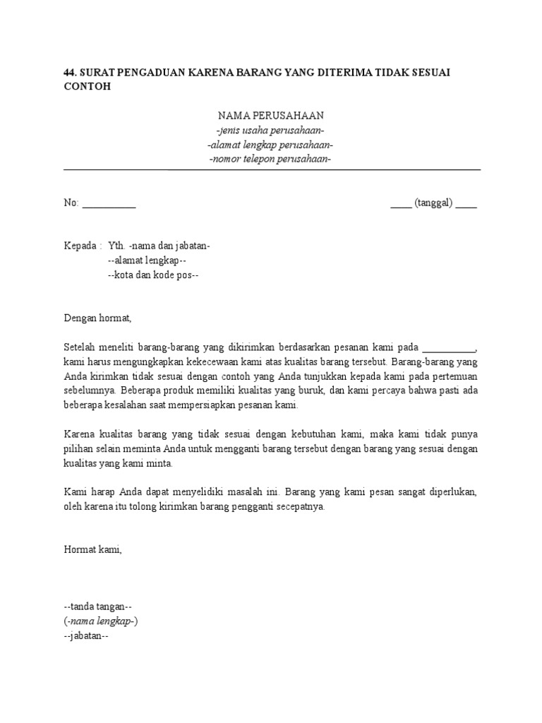 44. Surat Pengaduan Karena Barang Yang Diterima Tidak Sesuai Contoh