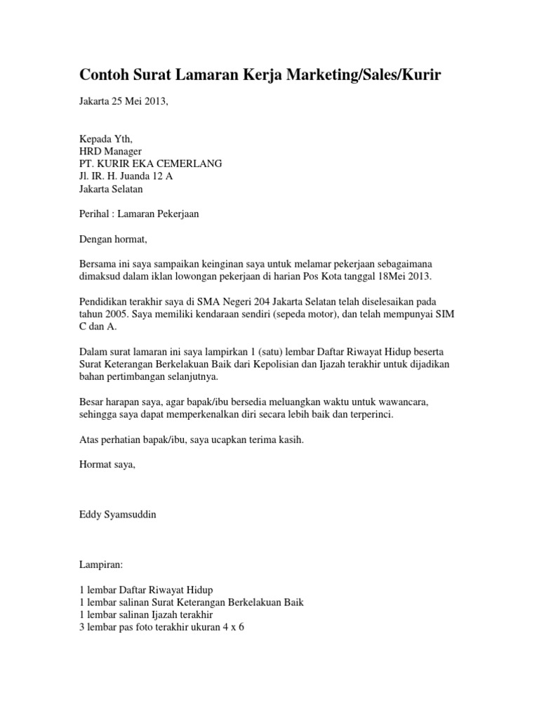Contoh Surat Lamaran Kerja Marketing Dalam Bahasa Inggris Dan …