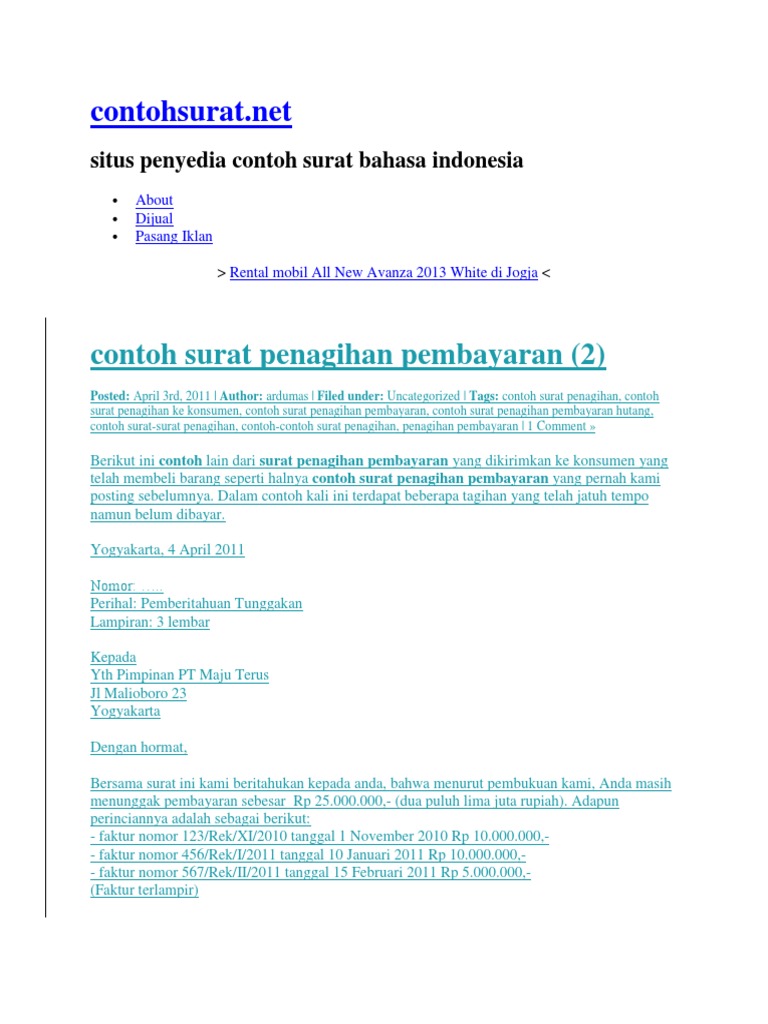 Contoh Format Surat Penagihan Hutang atau Pemberitahuan Tunggakan …