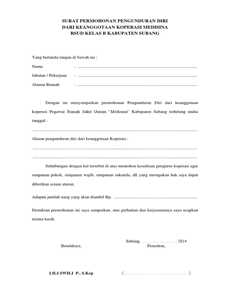 Surat Permohonan Pengunduran Diri Dari Keanggotaan Koperasi Pegawai Rsud Kelas b Medisina Kabupaten Subang