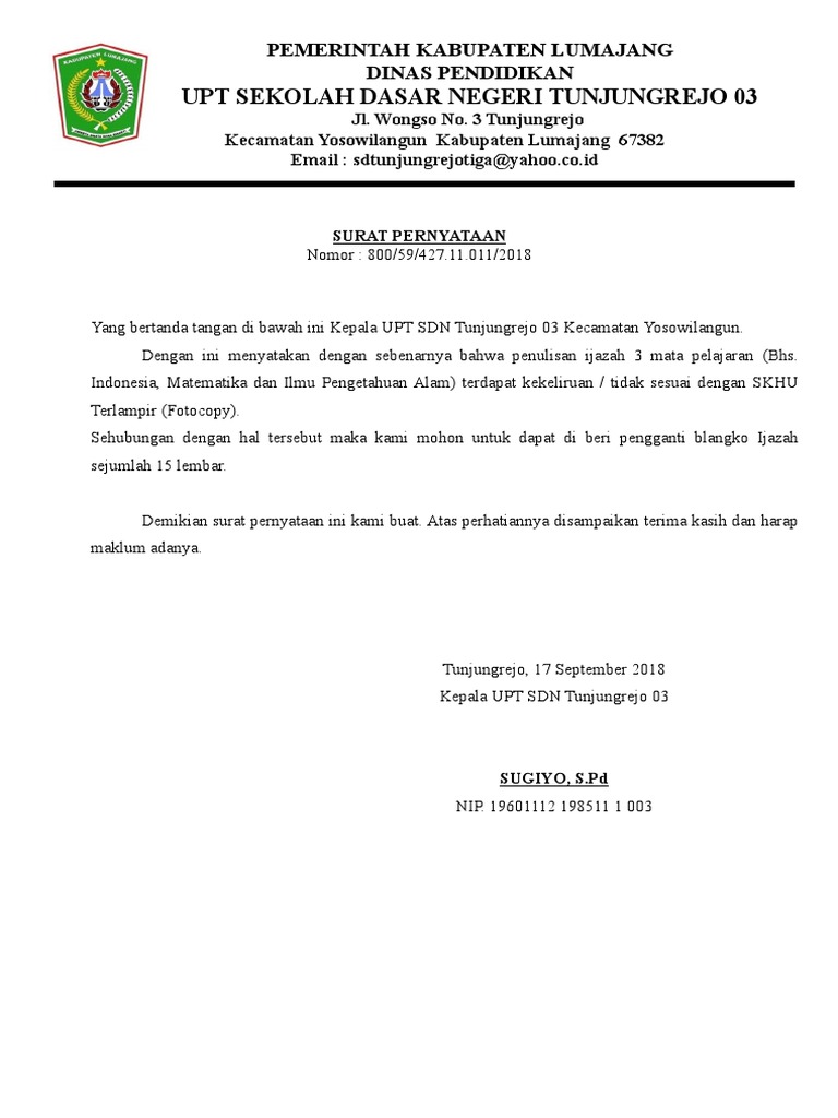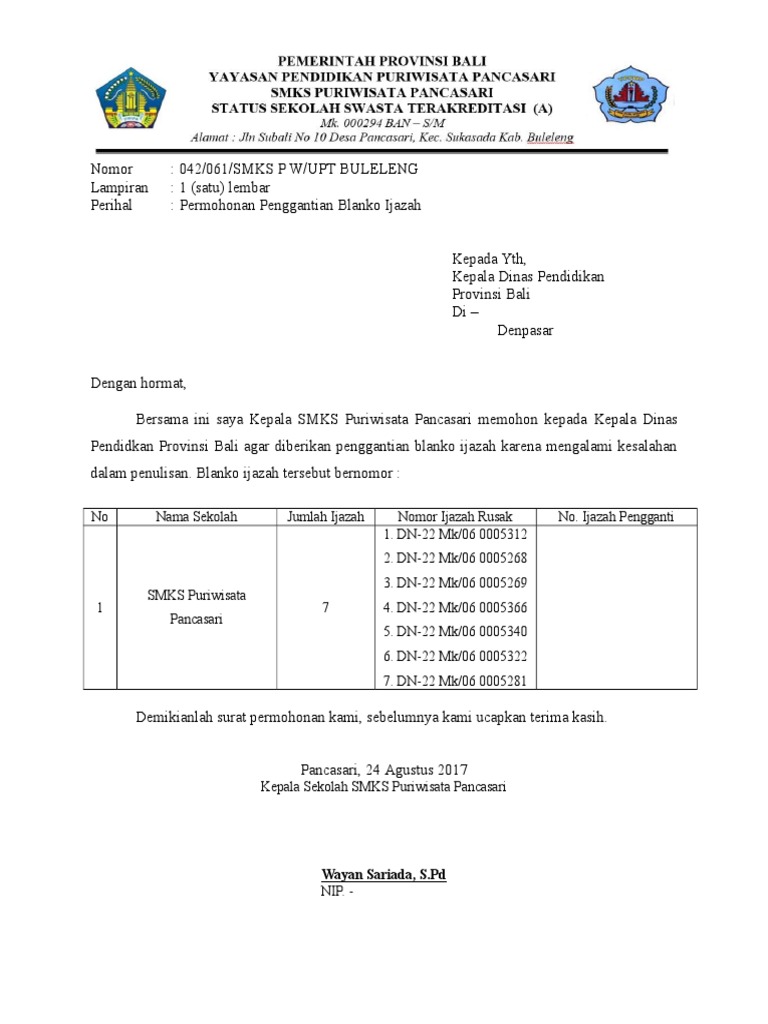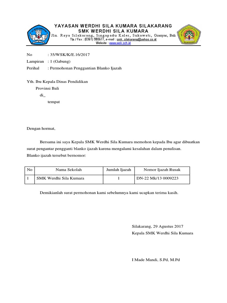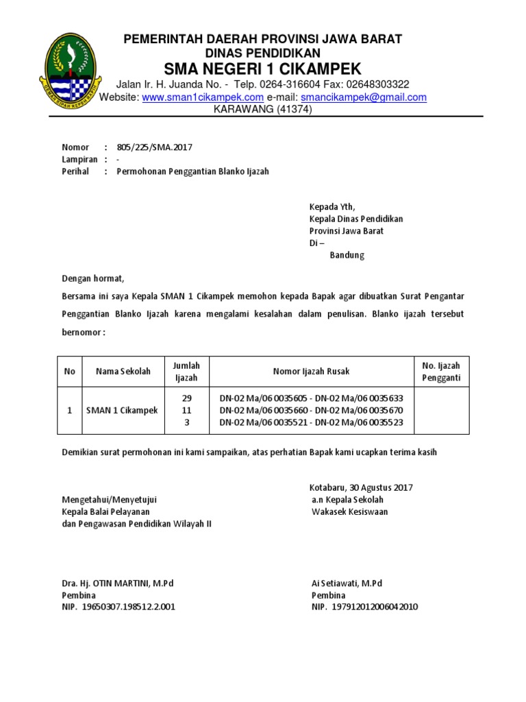 Contoh Surat Penggantian Blanko Ijazah Untuk SD SMP SMA SMK …