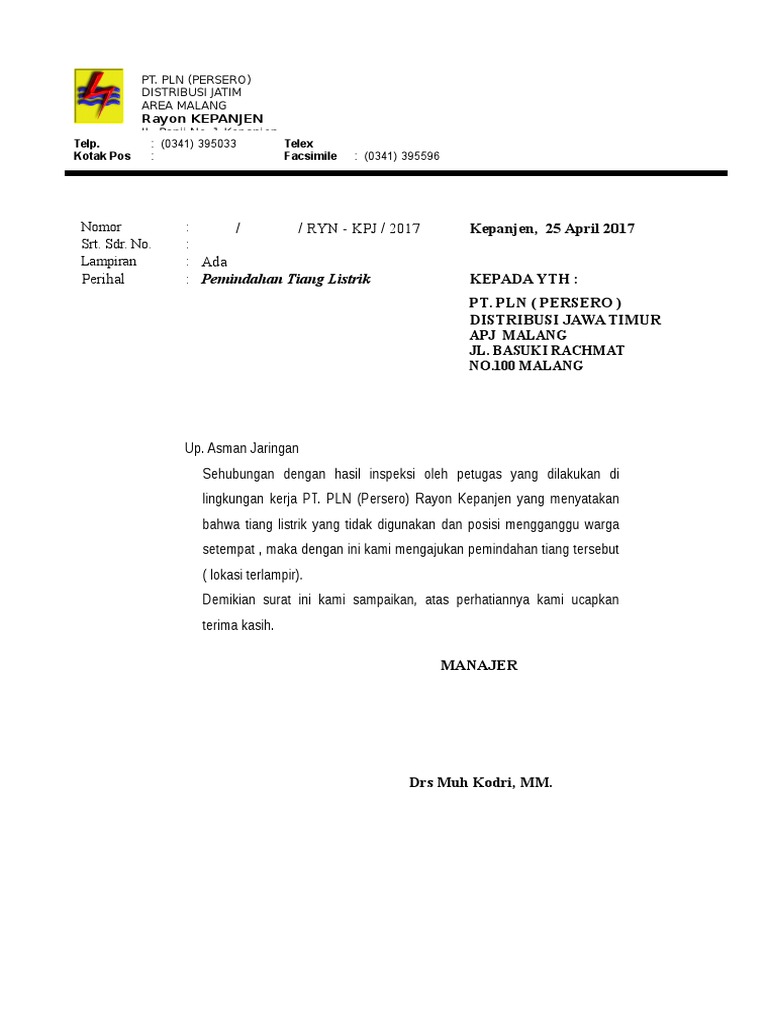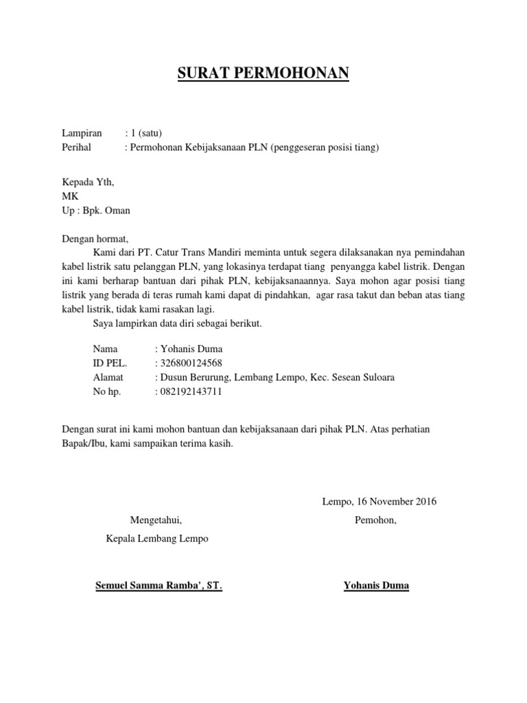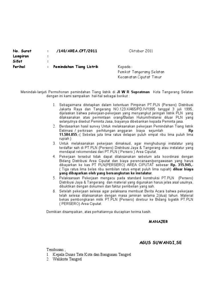 Surat Permohonan Pemindahan Tiang Listrik Pln - Contoh Seputar Surat