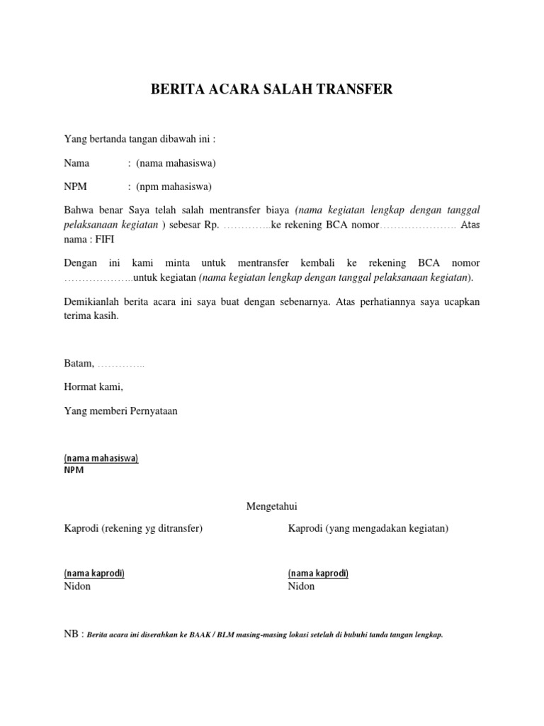 contoh surat pernyataan salah transfer bca - Gawe CV