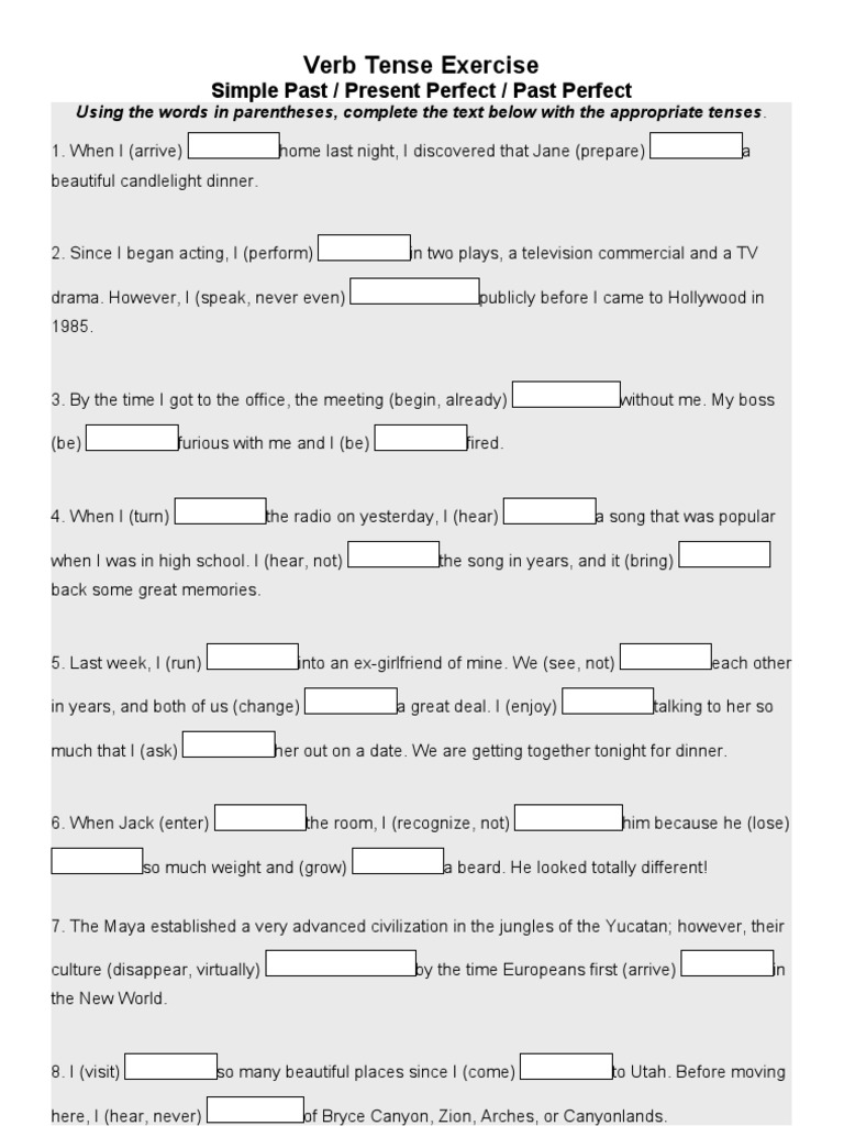 Verb Tense Exercise: Simple Past / Present Perfect / Past Perfect …