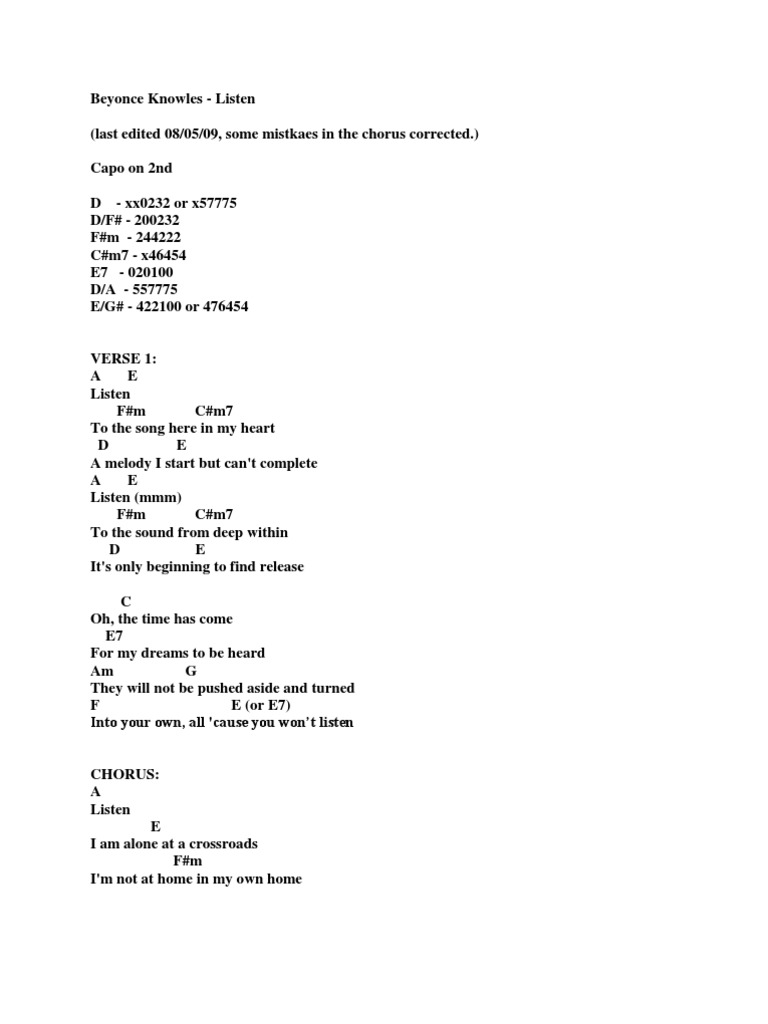 Beyoncé Knowles “Listen” Sheet Music (Leadsheet) in B Major …