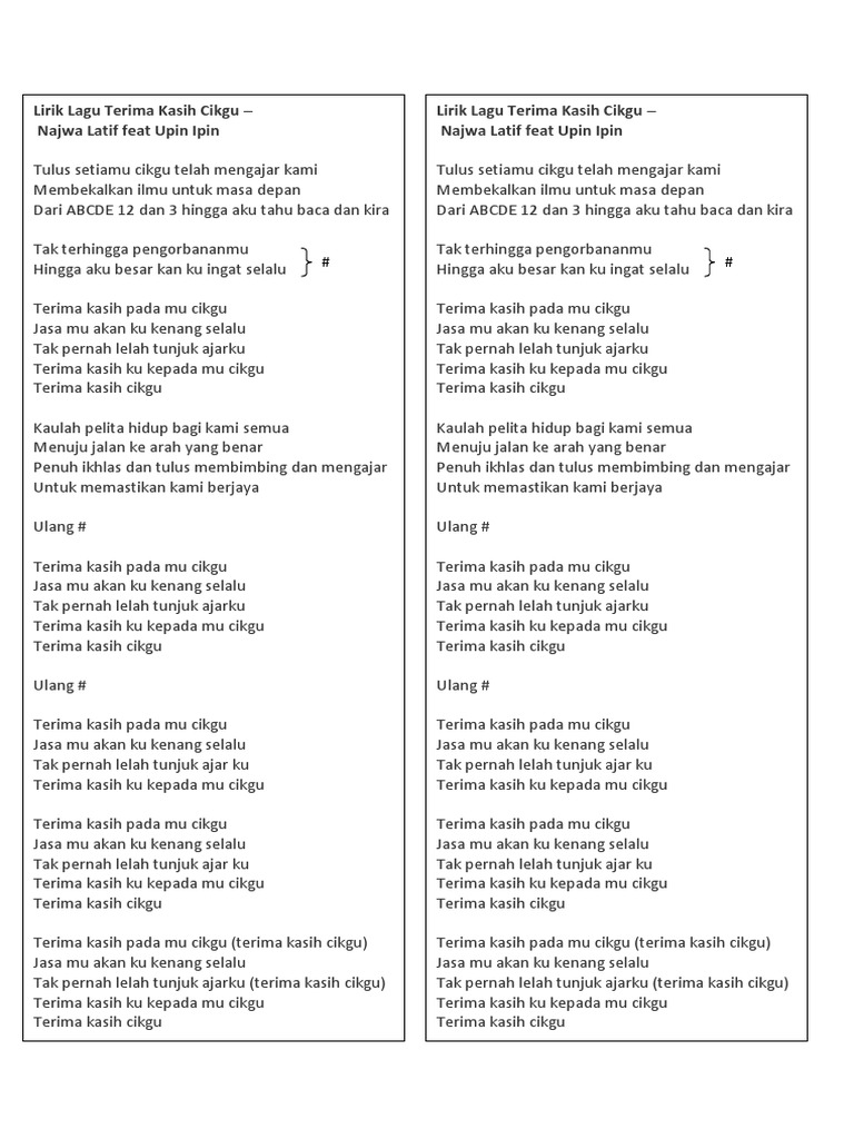 Lirik Lagu Terima Kasih Cikgu