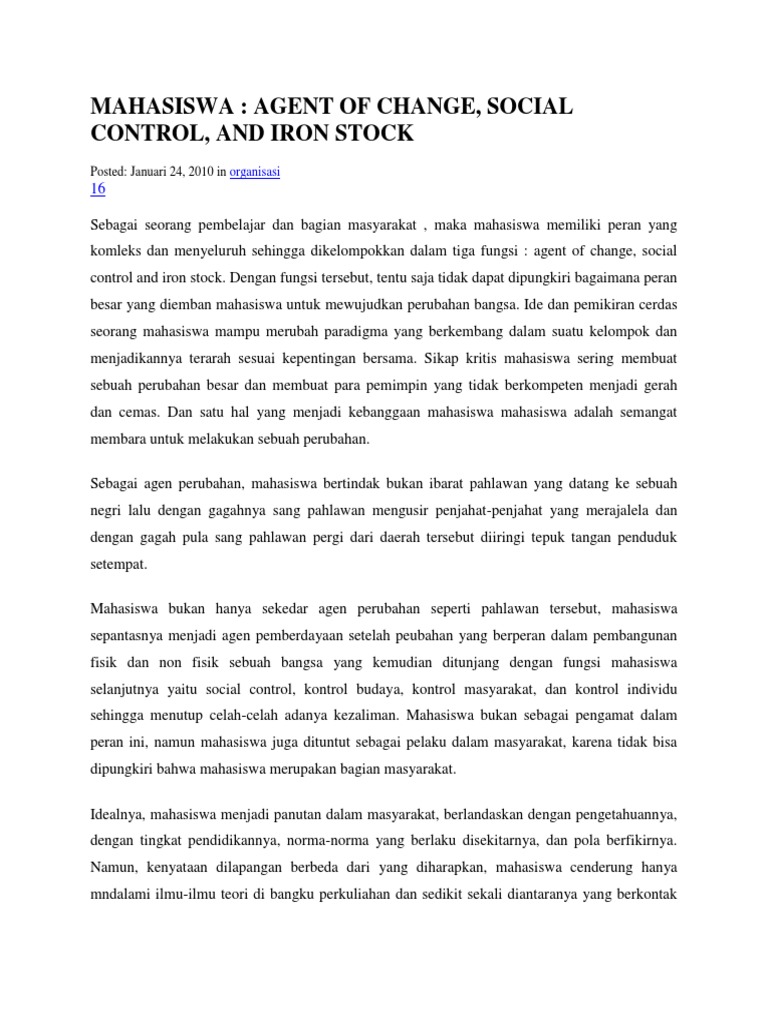 Essay Peran Mahasiswa Sebagai Agent Of Change Social Control Dan Iron Stock