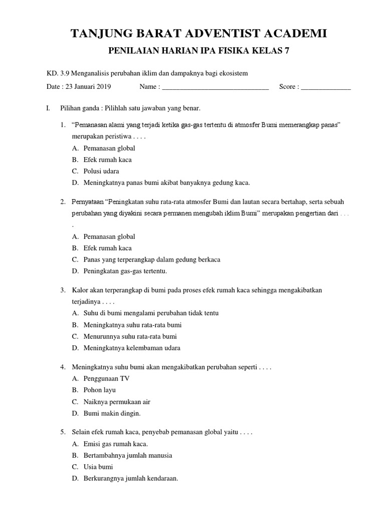 Soal Penilaian Harian 4: proses meningkatnya suhu di muka bumi