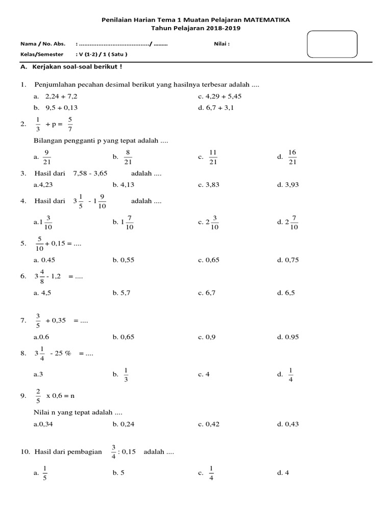 Penilaian Harian Tema 1 MATEMATIKA