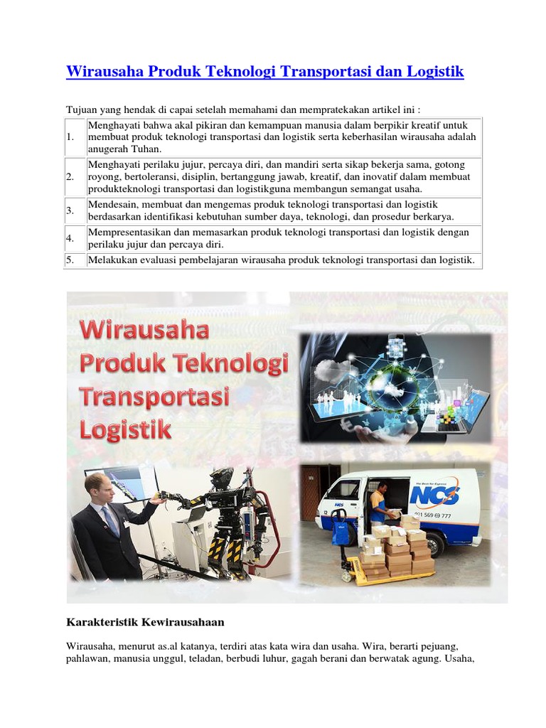 Wirausaha, Produk Teknologi, Transportasi, Logistik, Karakteristik …