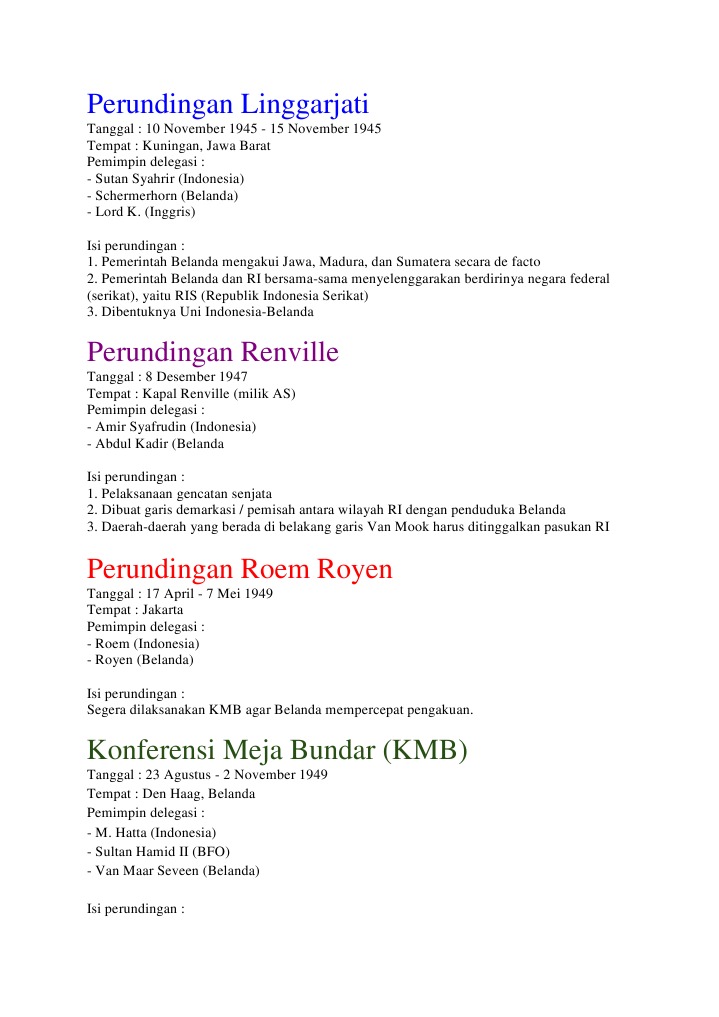 1.Sebutkan hasil Perjanjian! a.Linggarjati b.Renville c.Roem Royen …