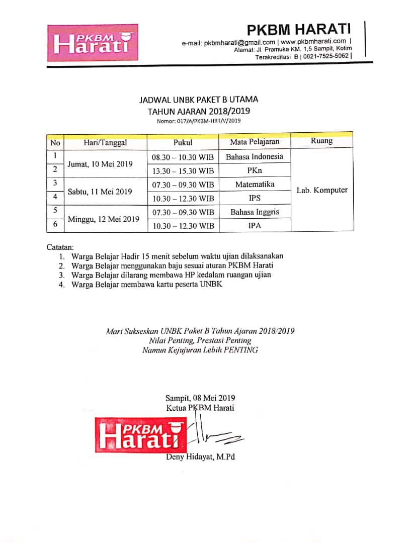 Jadwal UNBK Paket B Tahun Ajaran 2018/2019 - PKBM HARATI