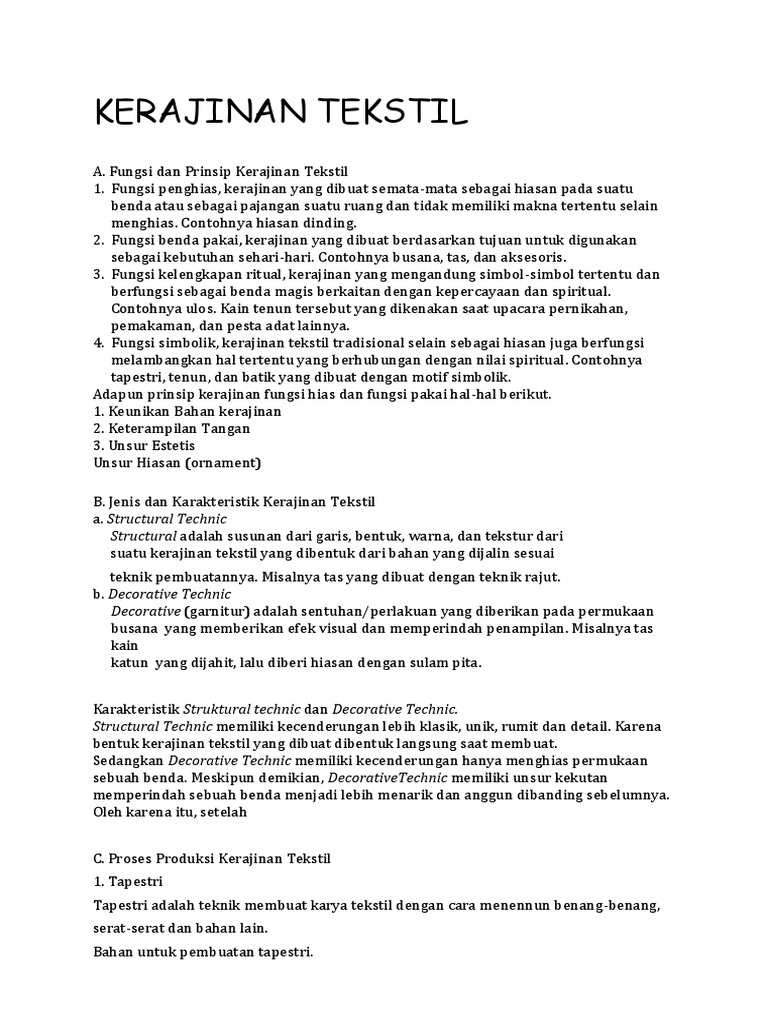 Peta Materi KERAJINAN TEKSTIL. Jenis dan Karakteristik. Kerajinan Tekstil. 1. Tapestri 2. Batik 3. Sulam 4. Jahit Aplikas - PDF Free Download