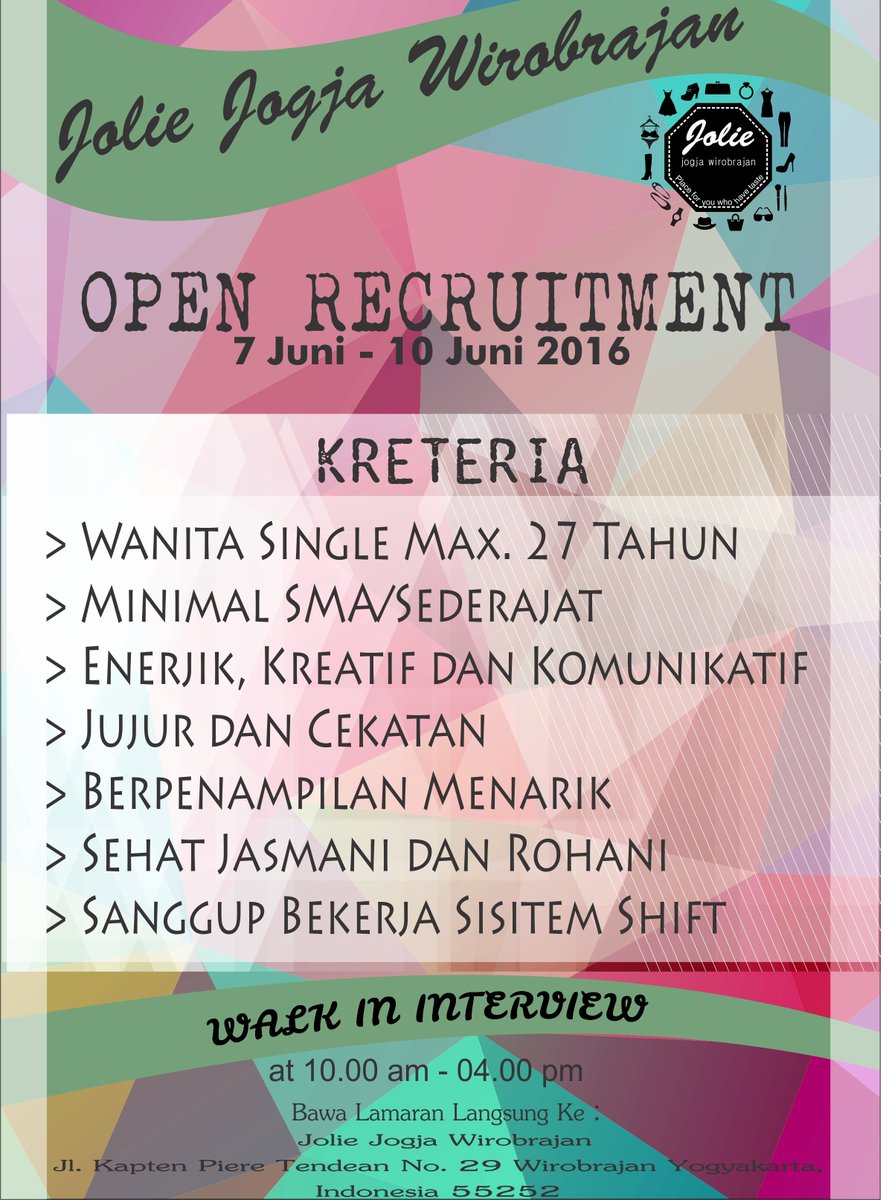 Jolie Wirobrajan בטוויטר: “Hai Jolie eratest Jolie Jogja Wirobrajan kembali open recruitment,ayo daftar ke Jolie Jogja Wirobrajan..… "