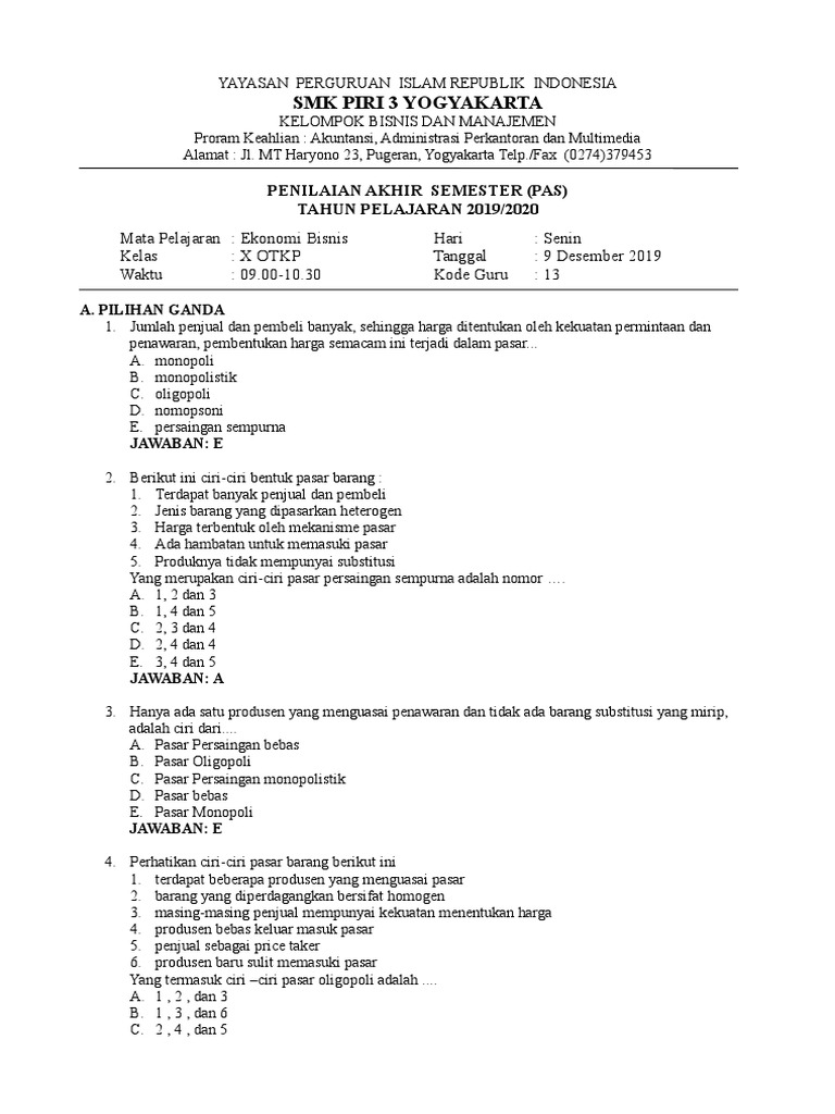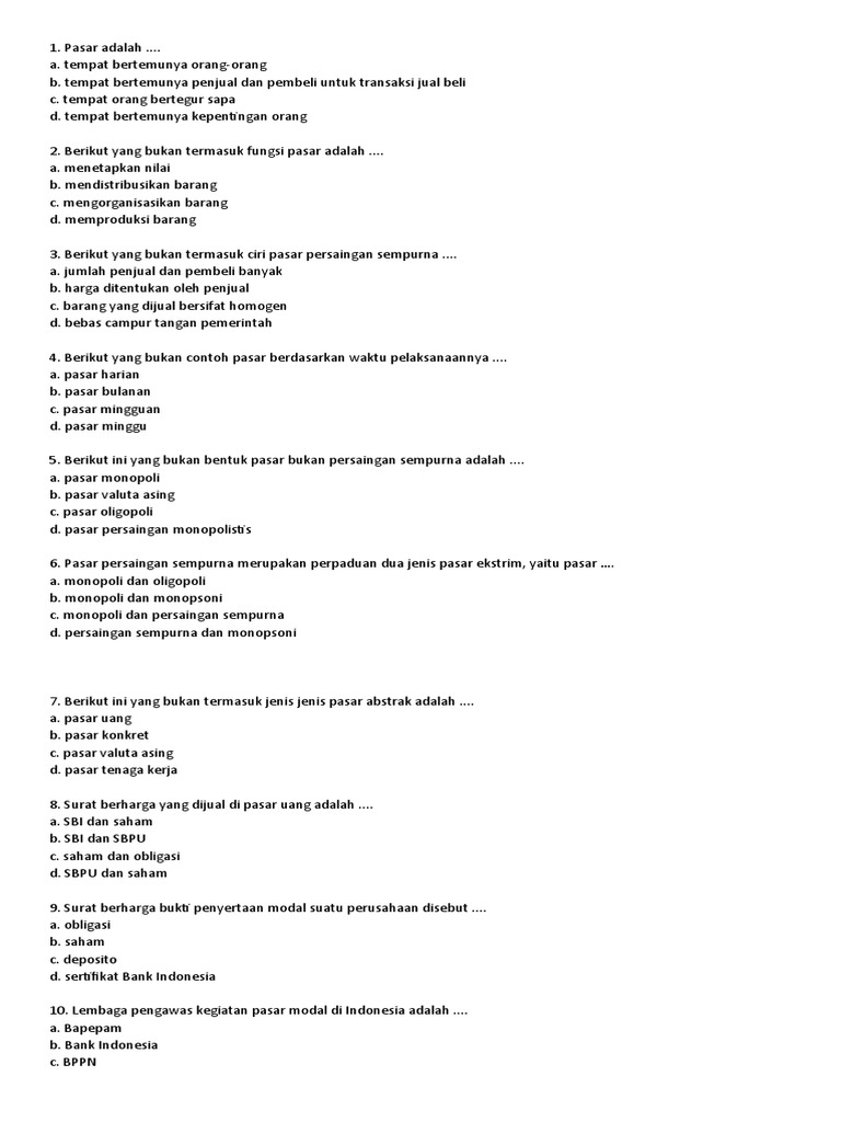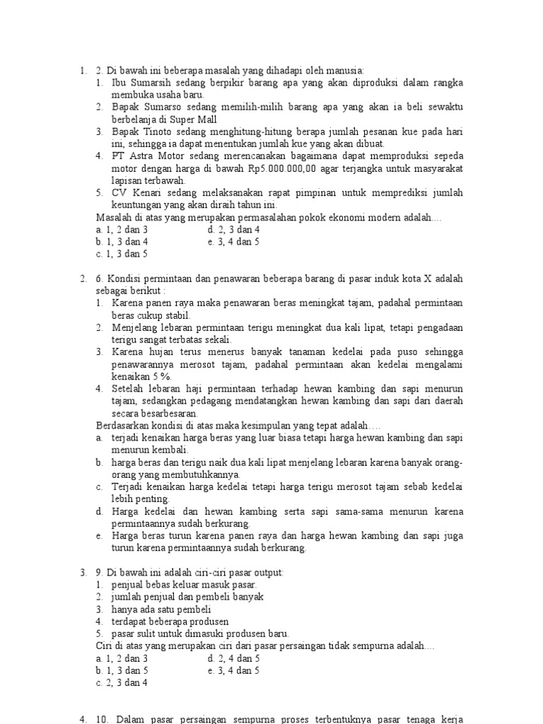 Soal Ekonomi Kelas x Pasar a Kunci