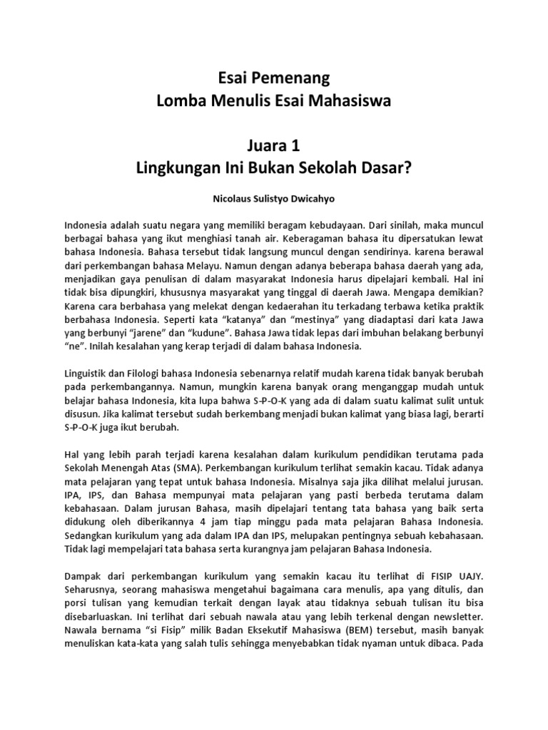 Esei Pemenang Lomba Esai Mahasiswa Bulan Bahasa 2011