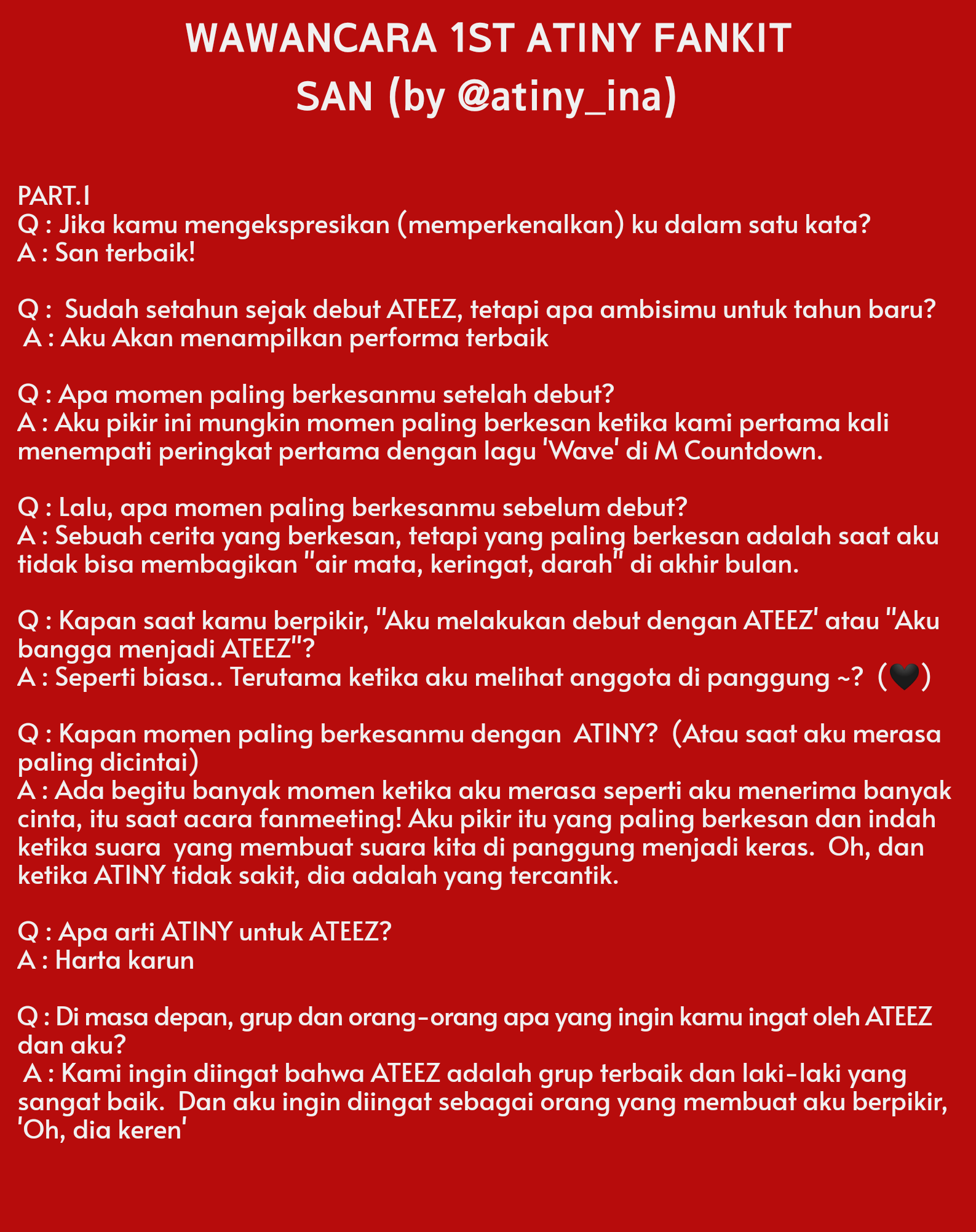 ⧗ATEEZ INDONESIA FANBASE⧖ (cek 📌) on Twitter: “➖INA TRANS➖ [📃] Wawancara 1기 Atiny Fankit #SAN re-upload or re-share please use credit! #ATINYINA #ATEEZINA #ATEEZ #ATINY #AtinyIndonesia @ATEEZofficial… https://t.co/UXhGMyDR3R”
