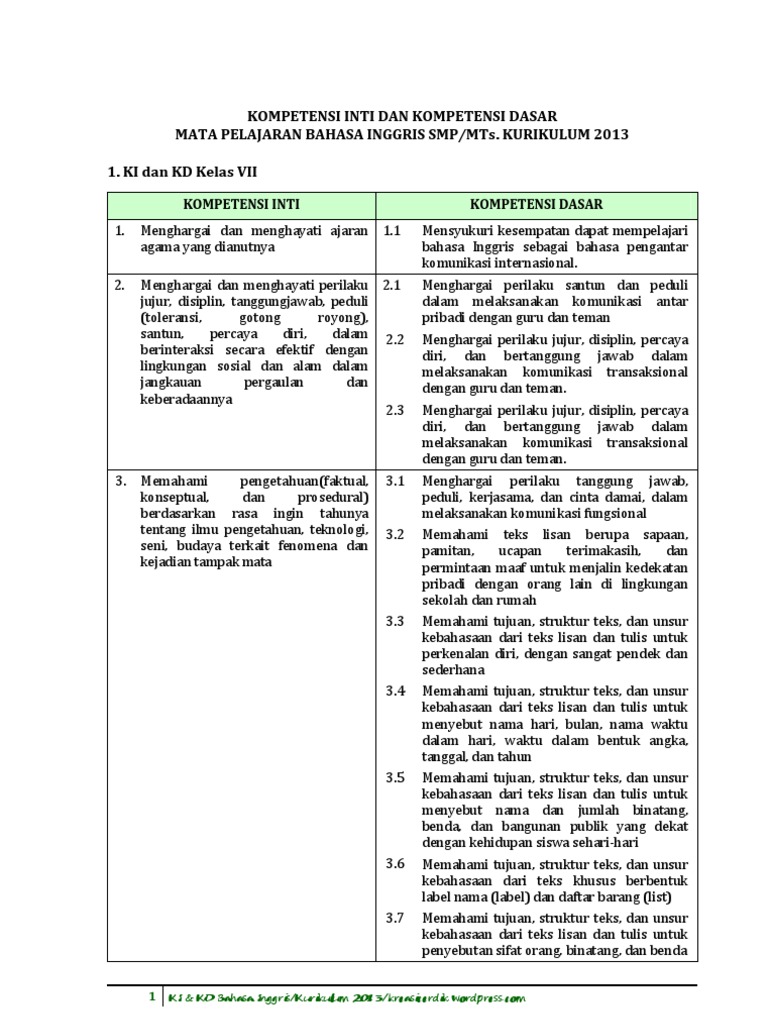 Ki Kd Bahasa Inggris Kelas 7 Revisi 2017 | Guru Paud