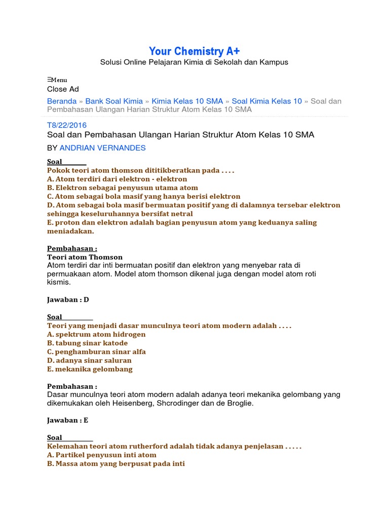 Soal dan Jawaban Kimia Pada Materi Teori Atom Kelas X Semester 1 …