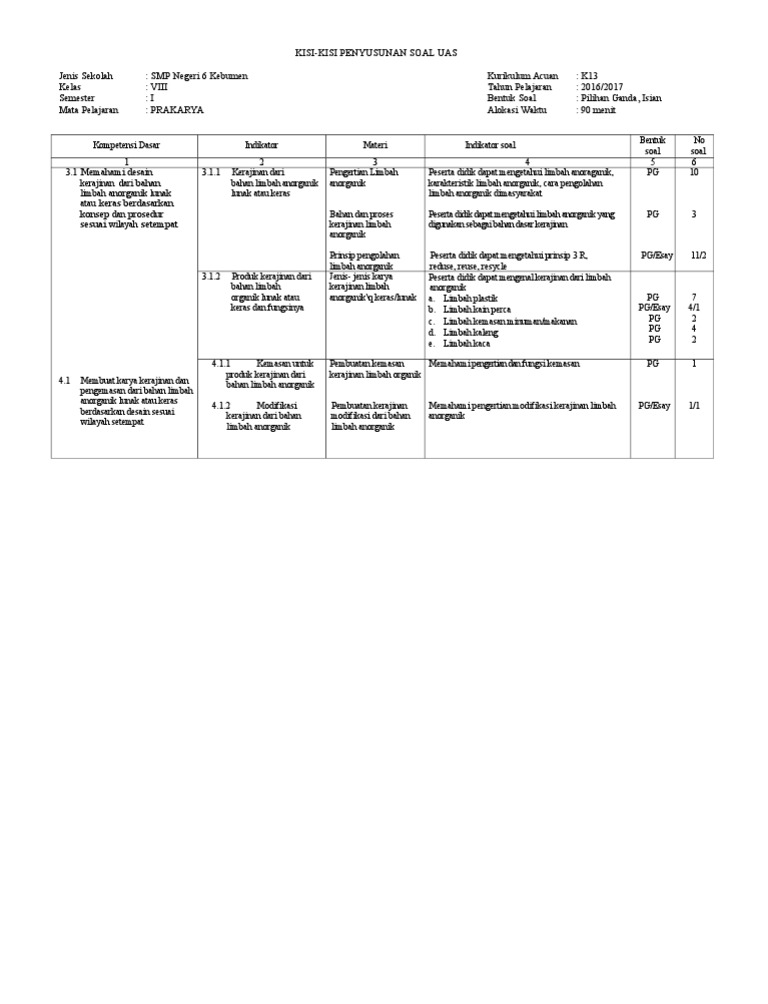 Kisi Kisi Soal Uas Prakarya Smp Kelas 8 k13