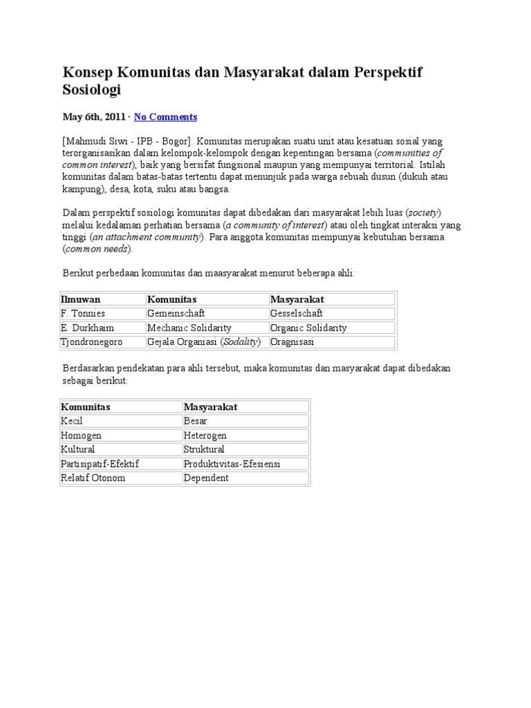 Konsep Komunitas Dan Masyarakat Dalam Perspektif Sosiologi