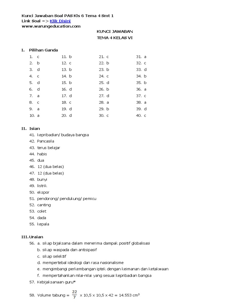 Kunci Jawaban Soal PAS / UAS Kelas 6 Tema 4 Semester 1/ Ganjil …