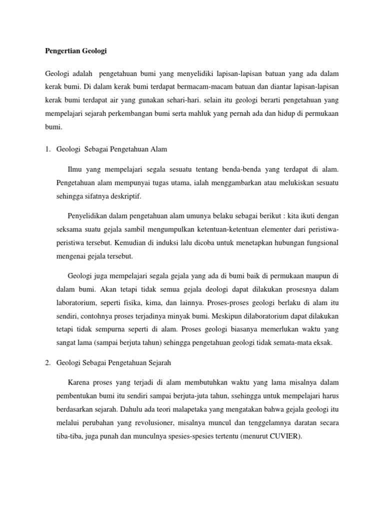 Pengertian Geologi Geologi adalah pengetahuan bumi yang menyelidiki lapisan-lapisan batuan yang ada dalam kerak bumi.