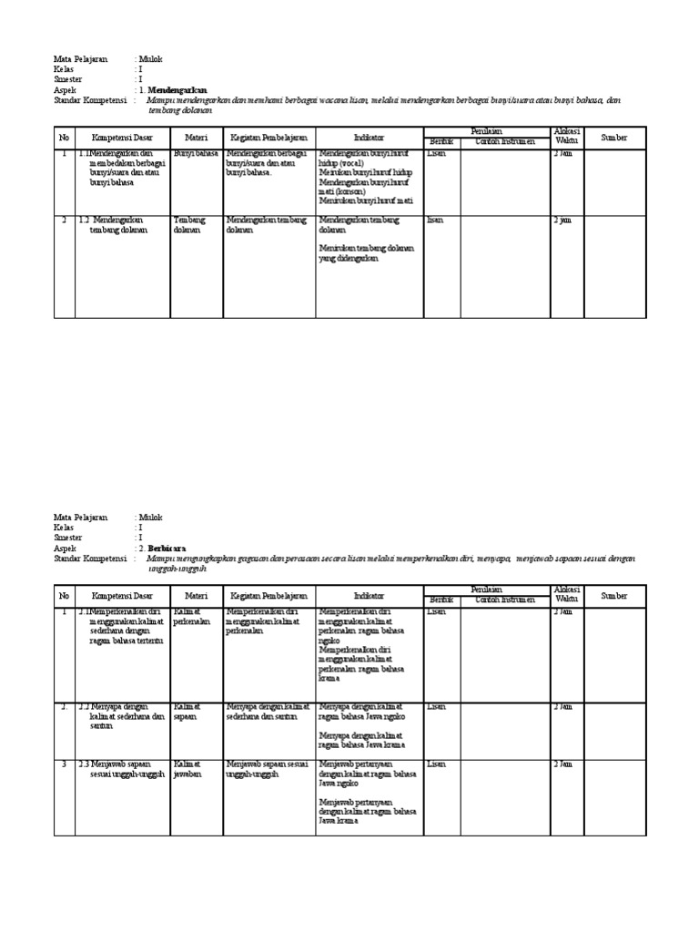Silabus Bahasa Jawa Kelas 1 Semester 1 Dan 2