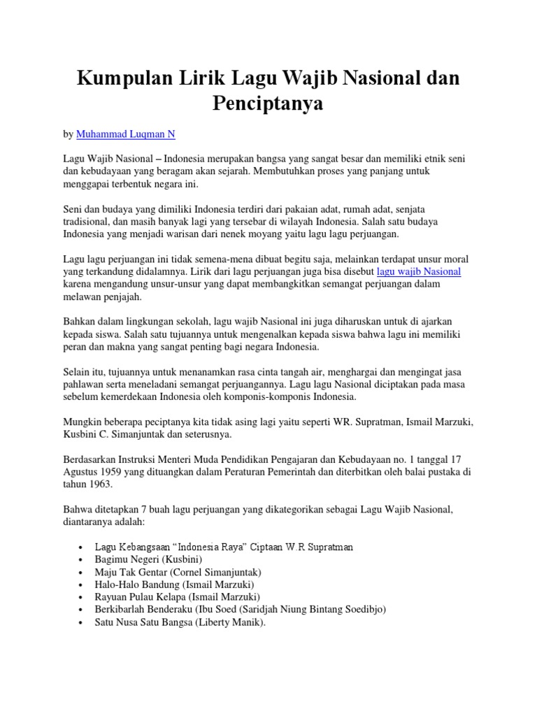 Kumpulan Lirik Lagu Wajib Nasional Dan Penciptanya